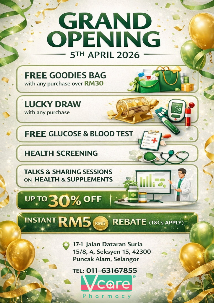 Vcare Pharmacy is opening a brand-new outlet in Puncak Alam, and we’re celebrating with exclusive promotions, free health checks, and exciting rewards — all in one day!